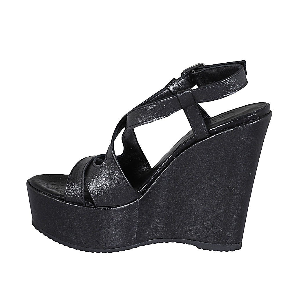 Sandalo da donna in pelle stampata laminata nera con cinturino, plateau e zeppa 12