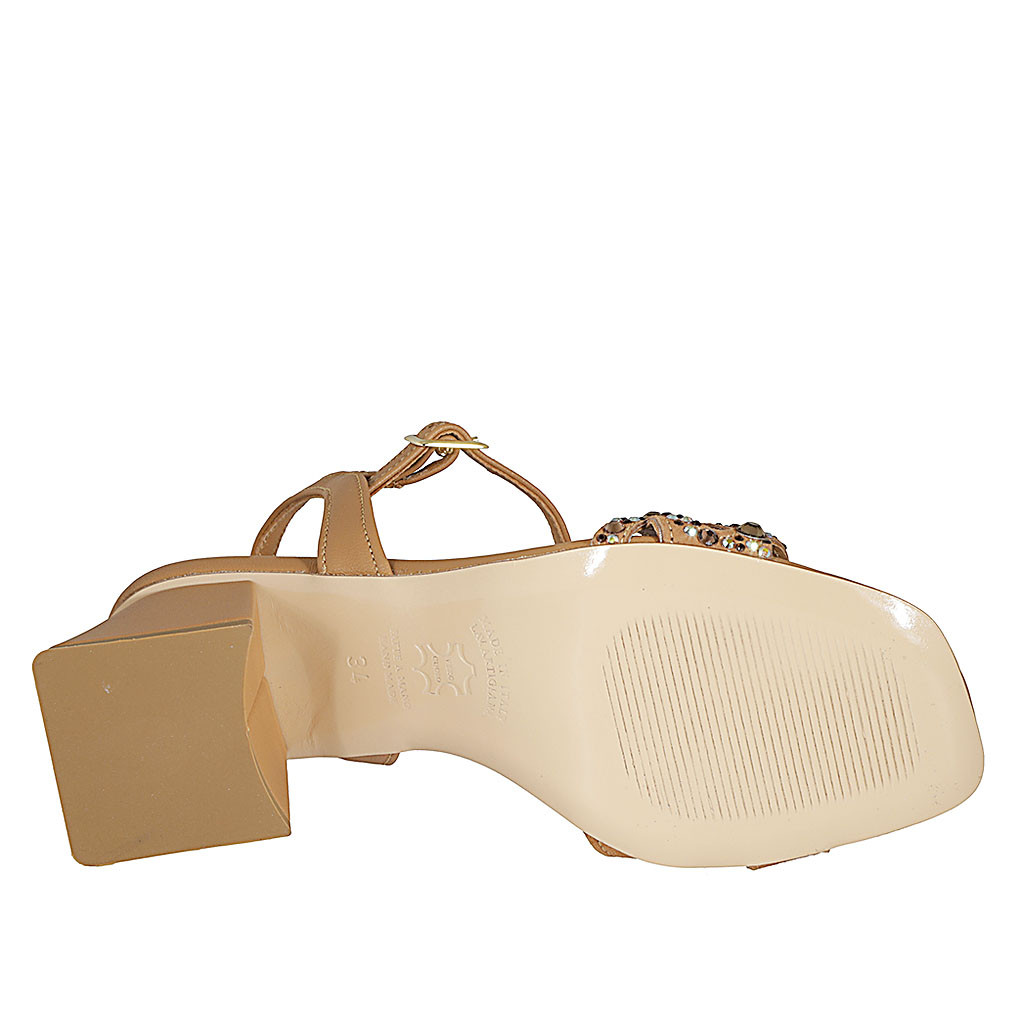 Sandalo da donna con cinturino e strass di cristalli multicolor in pelle color cuoio tacco 6 - Misure disponibili: 42, 44, 45, 46