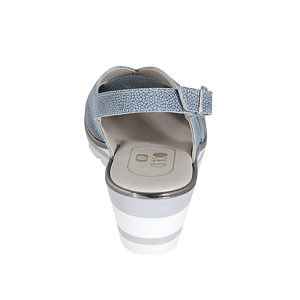 Sandalo da donna con plantare estraibile in pelle beige e camoscio beige stampato platino zeppa 5