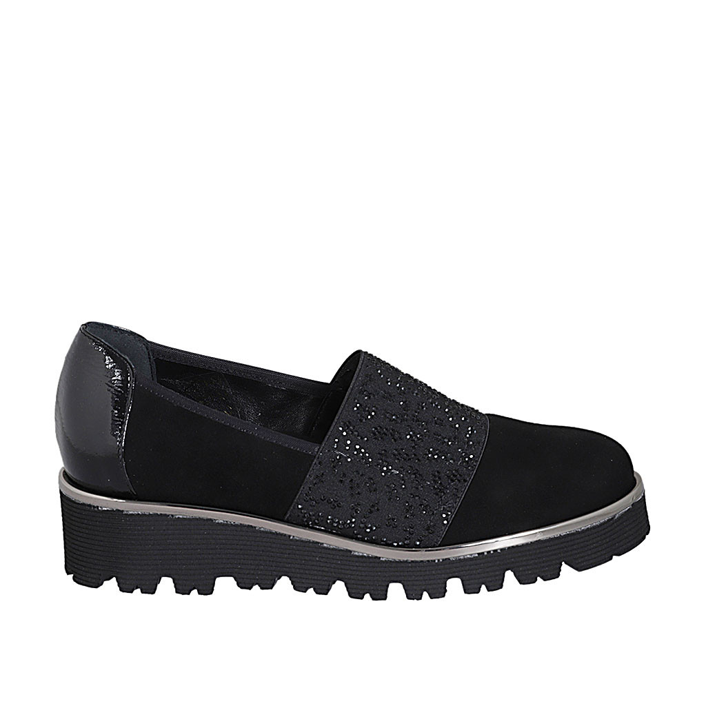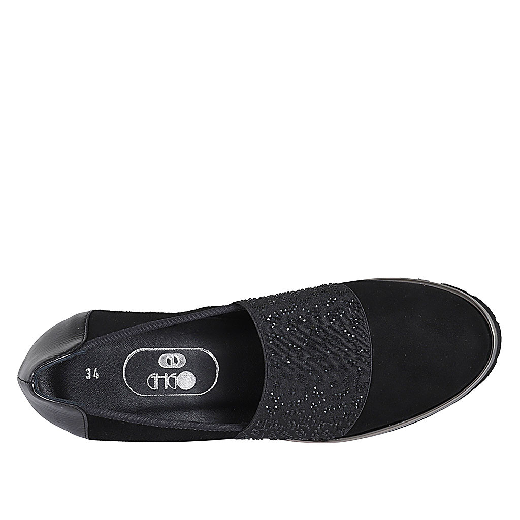 Scarpa accollata da donna con elastici, catena e plantare estraibile in pelle nera tacco 5
