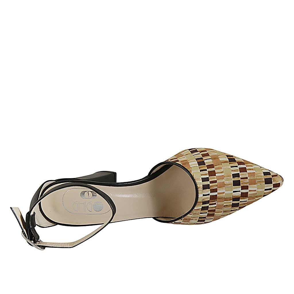Scarpa aperta a punta con cinturino in pelle nera e tessuto intrecciato multicolore tacco 9 - Misure disponibili: 42, 43