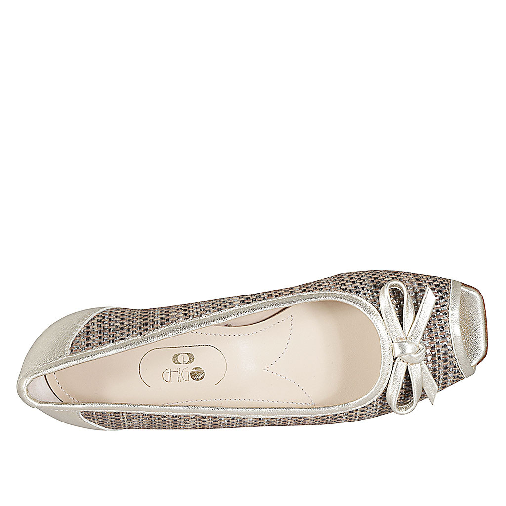Scarpa aperta in punta con fiocco in pelle laminata platino e tessuto intrecciato multicolor tacco 2 - Misure disponibili: 33, 34, 43, 44, 45, 46