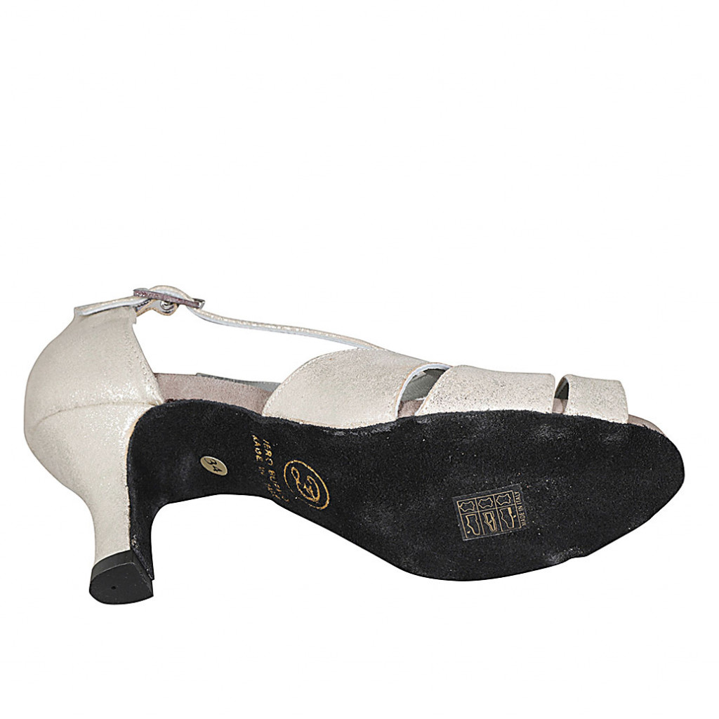 Scarpa da ballo a punta aperta con cinturino incrociato in camoscio laminato platino tacco 8 - Misure disponibili: 33, 42, 43, 44