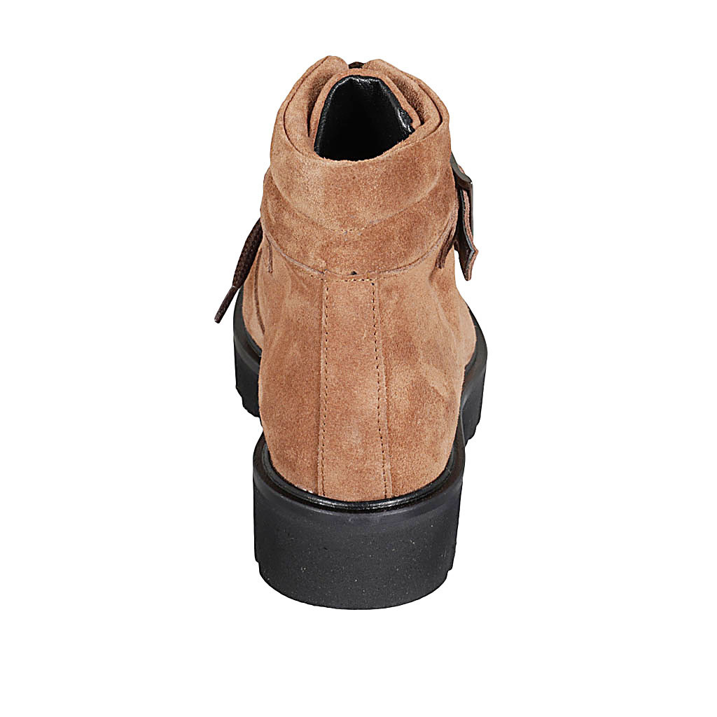 Stivaletto stringato da donna con fibbia in camoscio color cuoio tacco 4