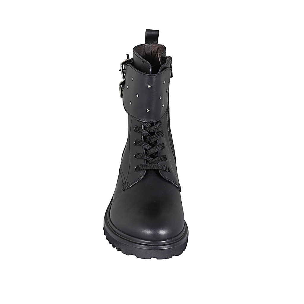 Stivaletto da donna con fibbie, strass e cerniera in pelle nera tacco 3