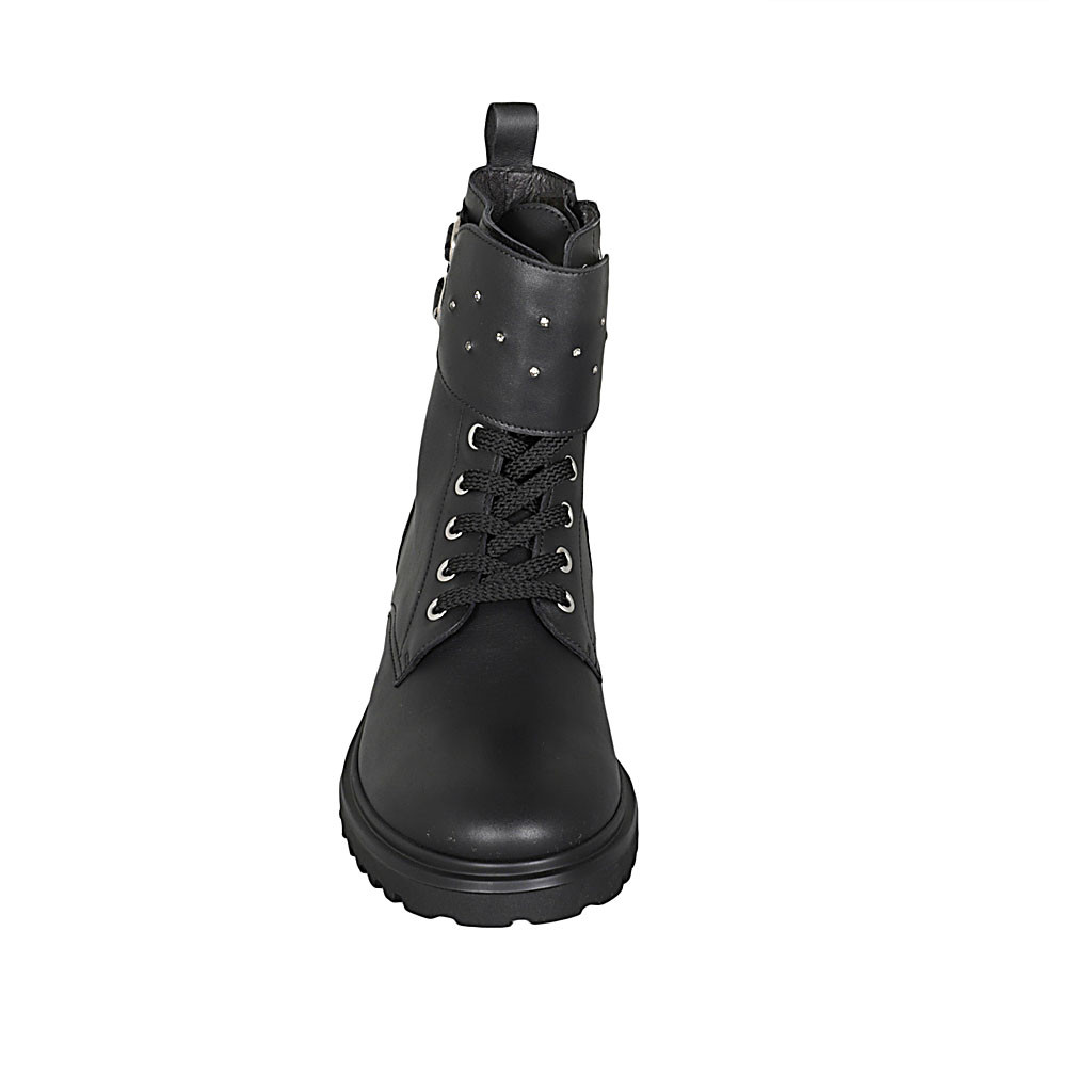 Stivaletto stringato da donna con cerniera, borchie e fibbie in pelle nera tacco 3