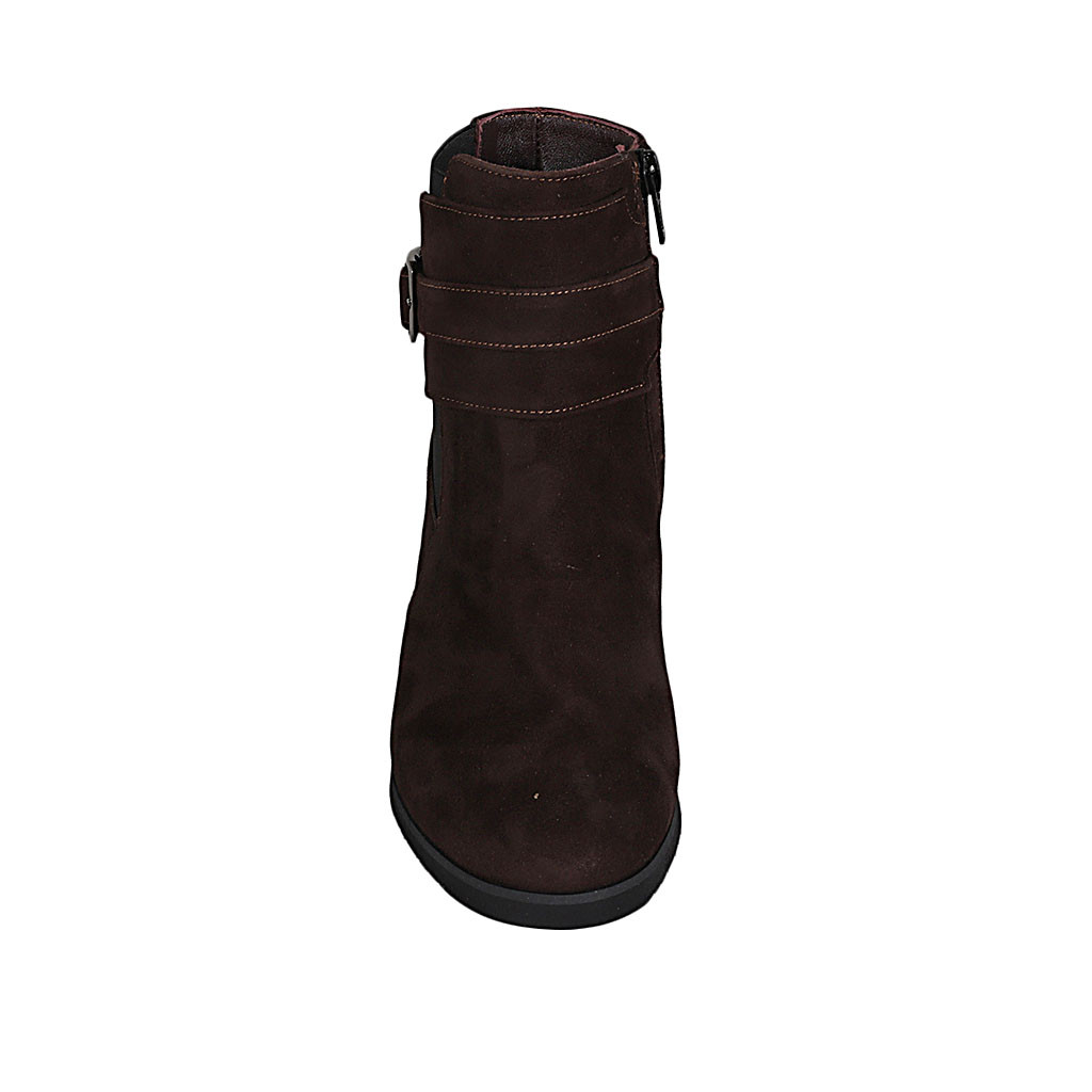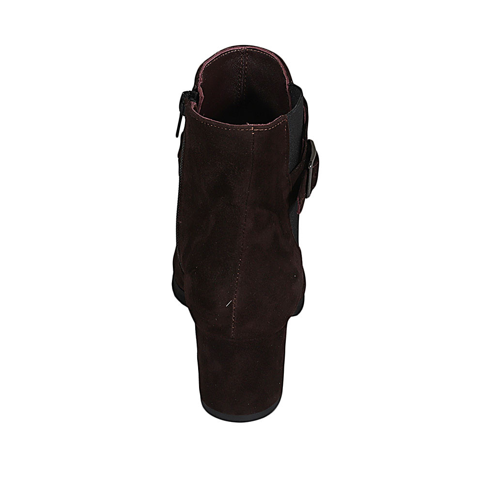 Stivaletto da donna con plantare estraibile, cerniera, fibbia ed elastico in camoscio marrone tacco 6