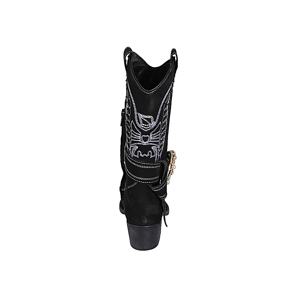 Stivale texano da donna con mezza cerniera, fibbia con strass e ricamo bianco in camoscio nero tacco 5 - Misure disponibili: 32, 33, 34