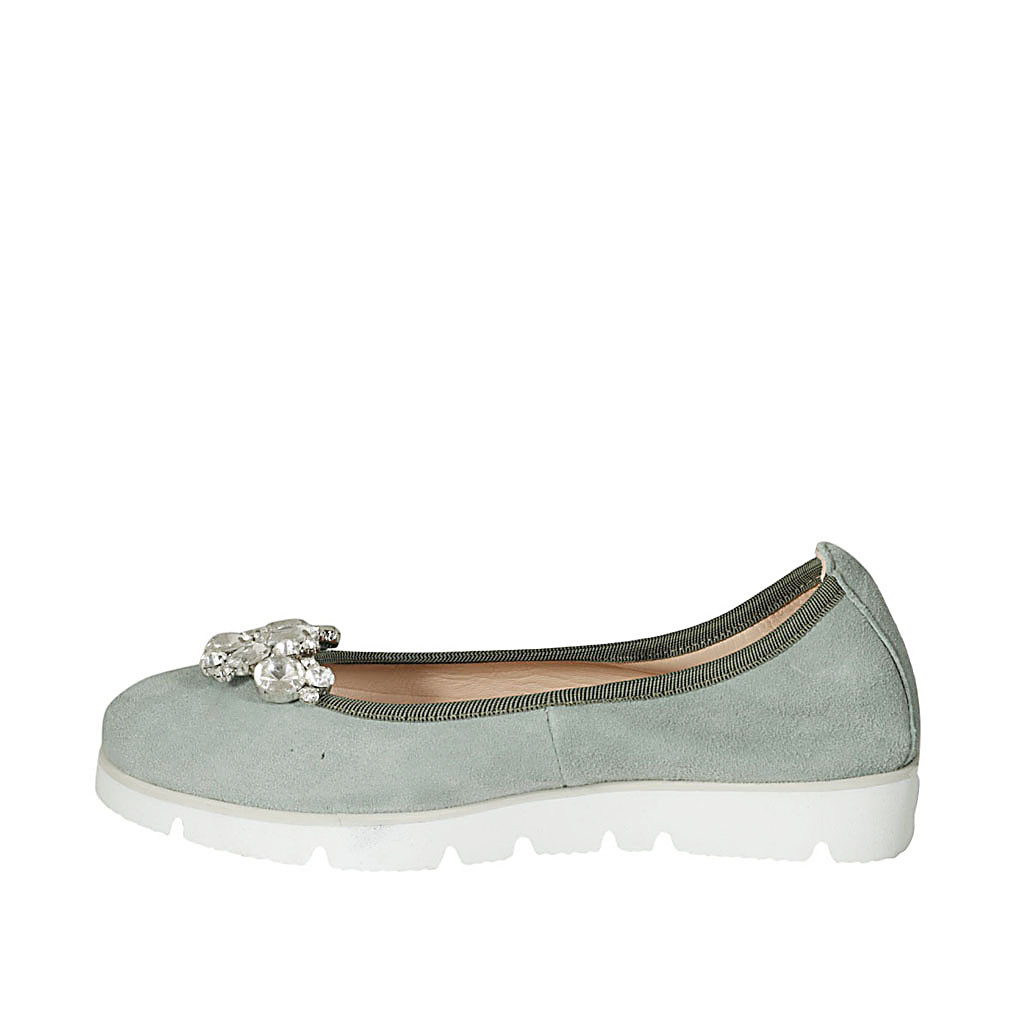 Woman's ballerina shoe in sage green suede with removable rhinestone clip-on wedge heel 3
