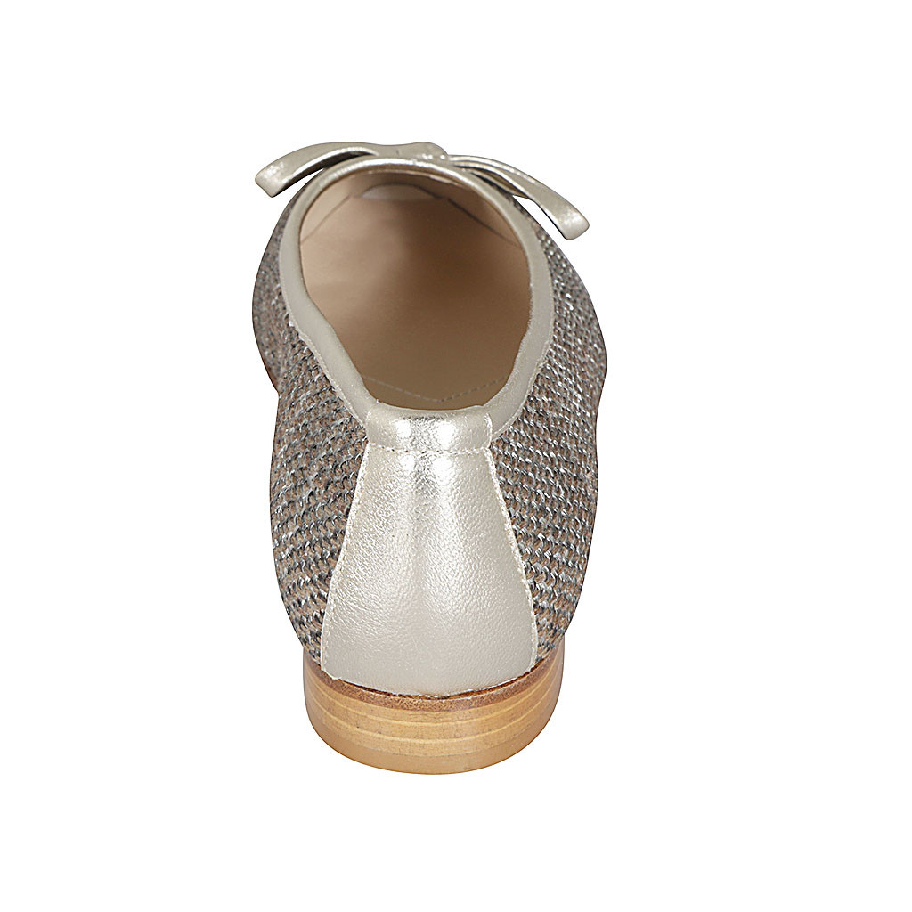 Woman's ballerina shoe with bow in platinum laminated leather and multicolored braided fabric heel 2