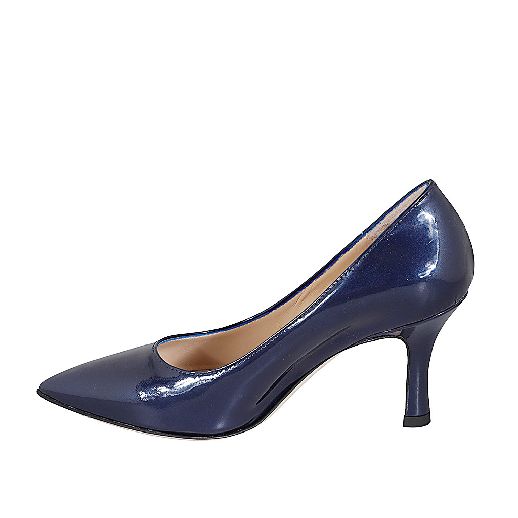 Woman's pointy pump in laminated blue patent leather with heel 8