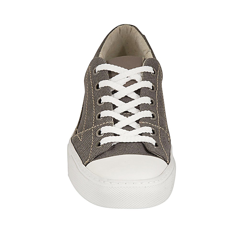 Men's laced sports shoe in grey fabric and taupe and white leather