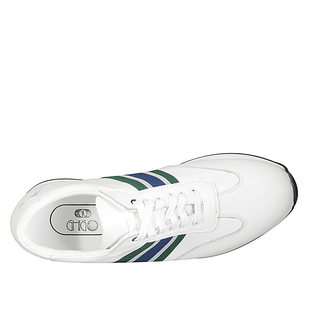 Men's laced casual shoe with removable insole in white leather and blue, green and grey fabric