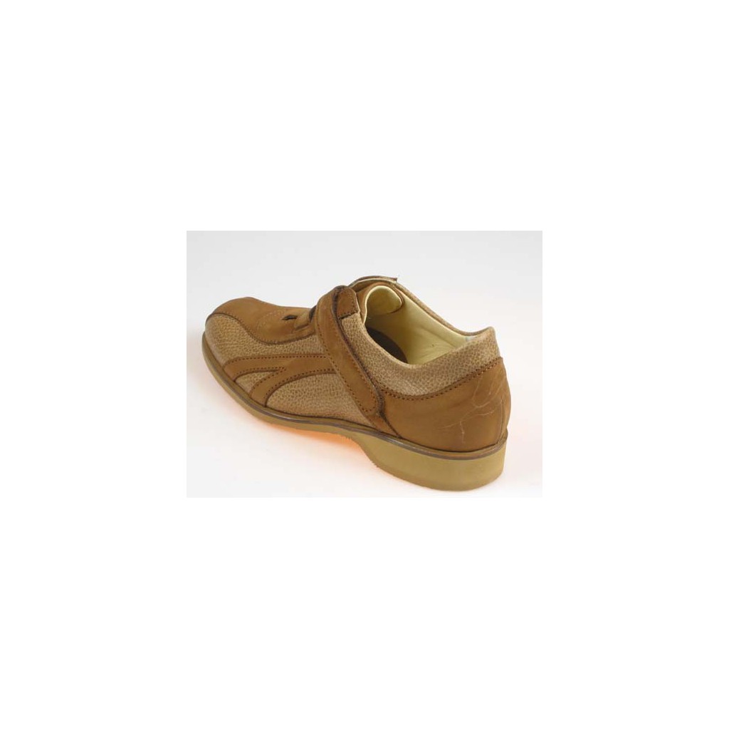Men's casual shoe with velcro strap, in dark and light tan leather, rubber sole, leather lining.