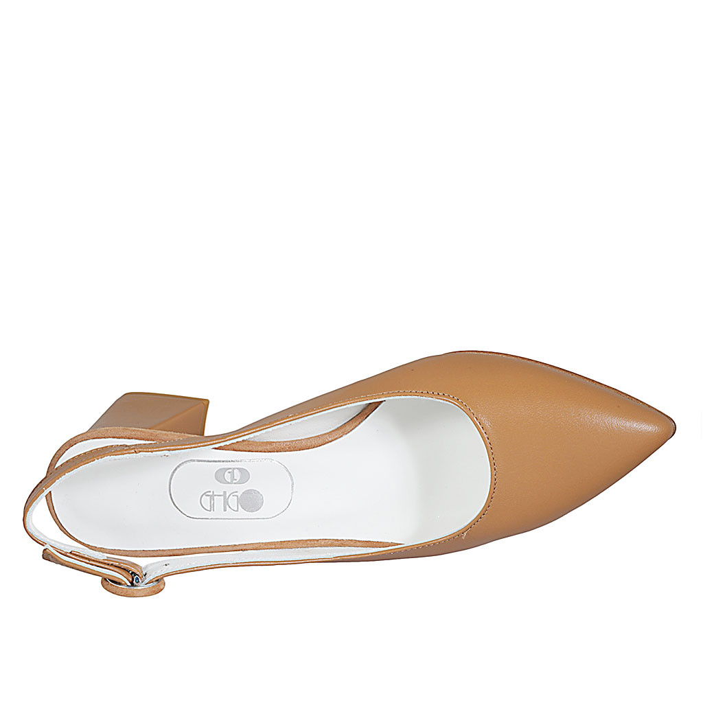 Woman's pointy slingback pump in cognac brown leather heel 6