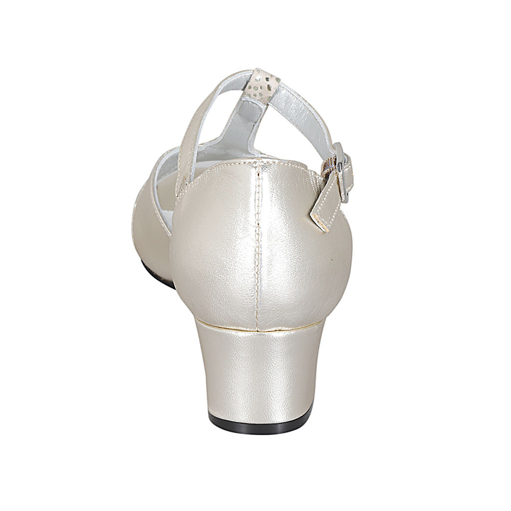 Dancing shoes with strap in platinum laminated leather and printed beige suede heel 4