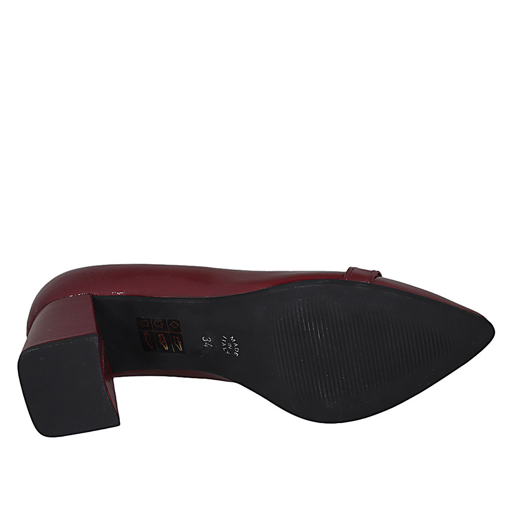Women's pointy pump shoe with accessory in maroon patent leather heel 6
