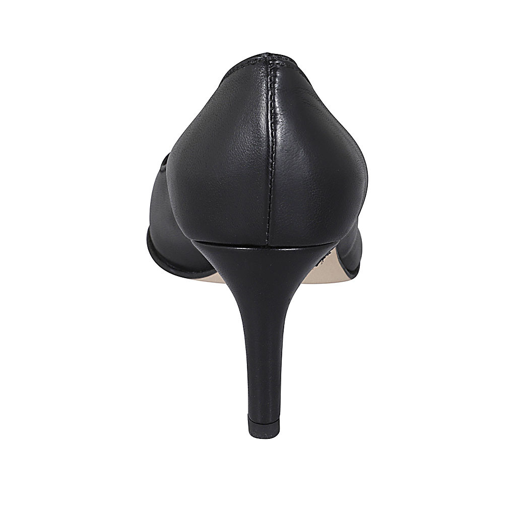 Woman's ankle boot in black leather with zipper and buckle heel 5