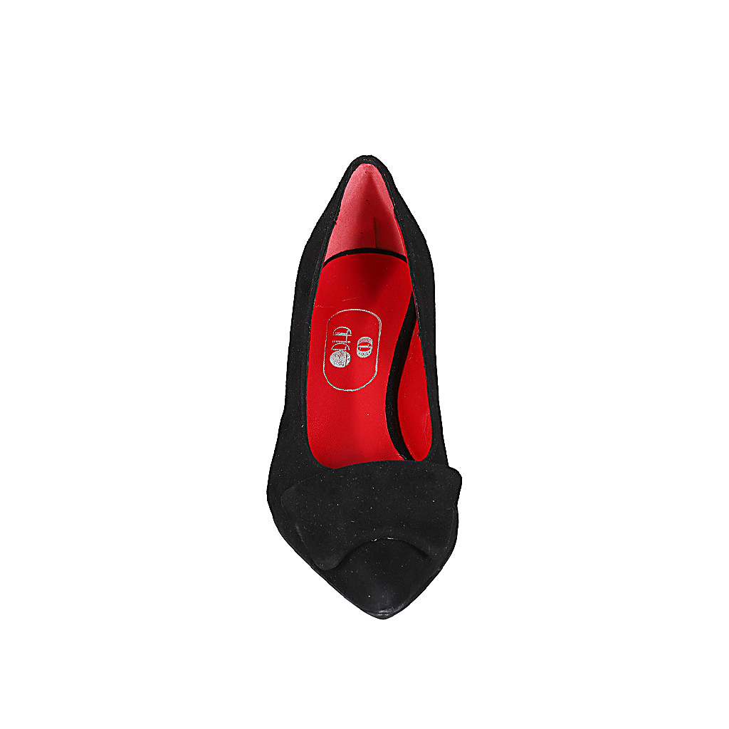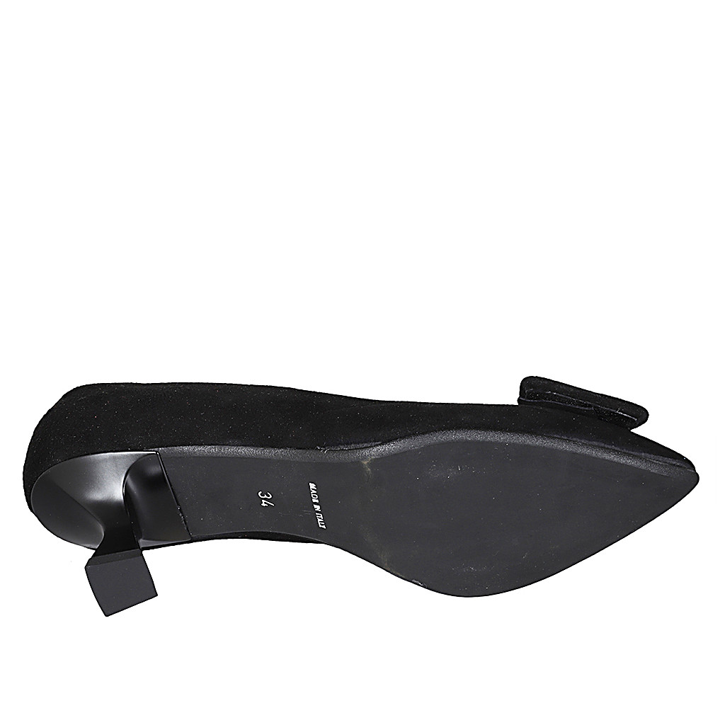 Woman's pointy pump in black suede with accessory and spool heel 6