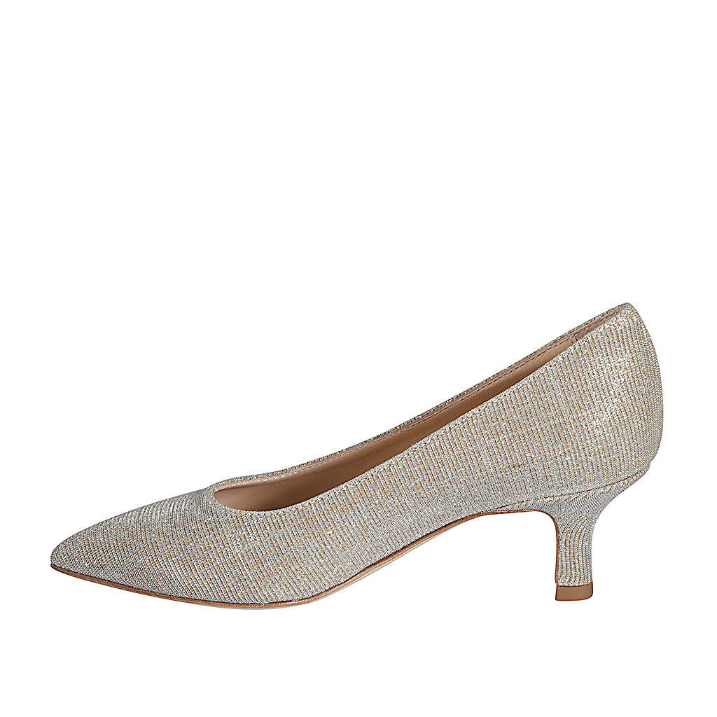 Woman's pointy pump in platinum laminated glittered fabric heel 5
