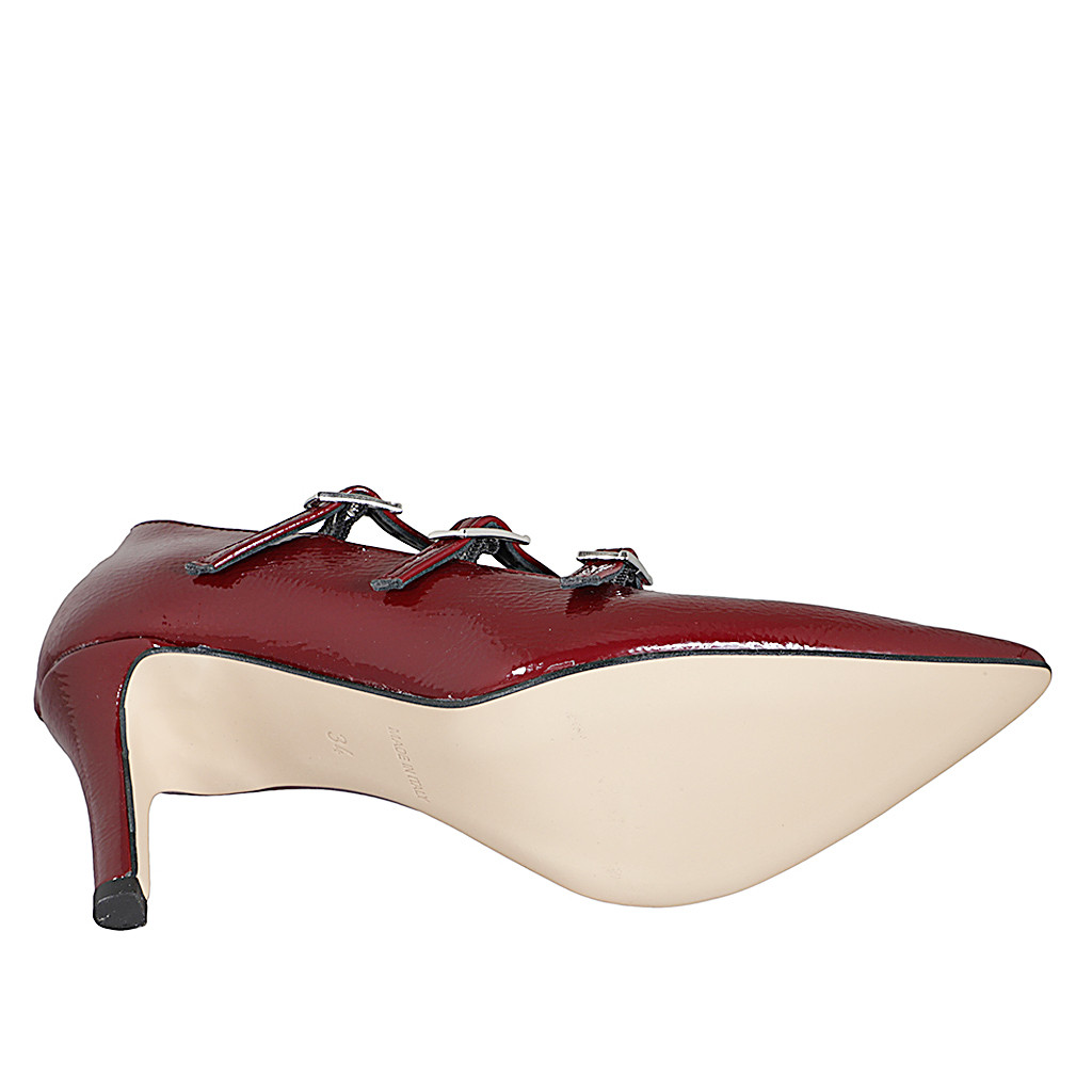 Pointed-toe Mary Jane pumps in maroon patent leather heel 7