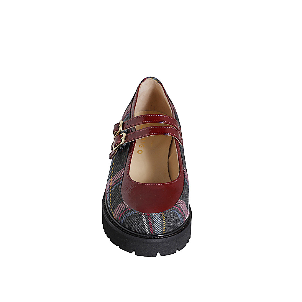 Woman's Mary Jane pump with straps in multicolored tartan fabric and maroon patent leather heel 4