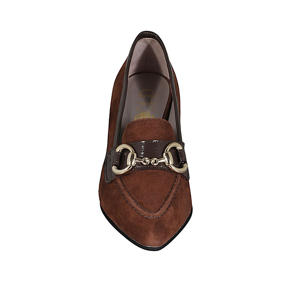 Woman's pointy mocassin in light grey patent leather and suede edges, heel 2