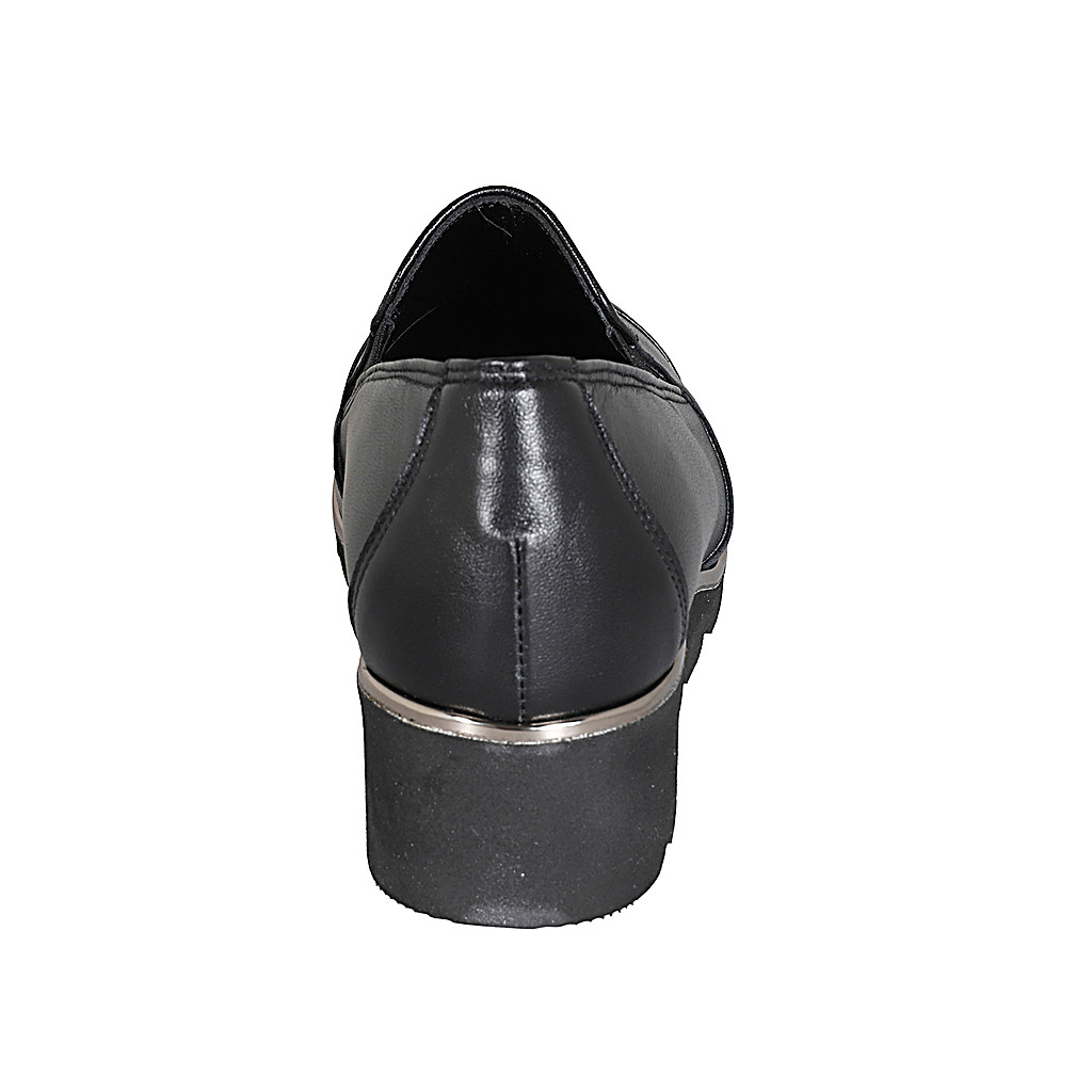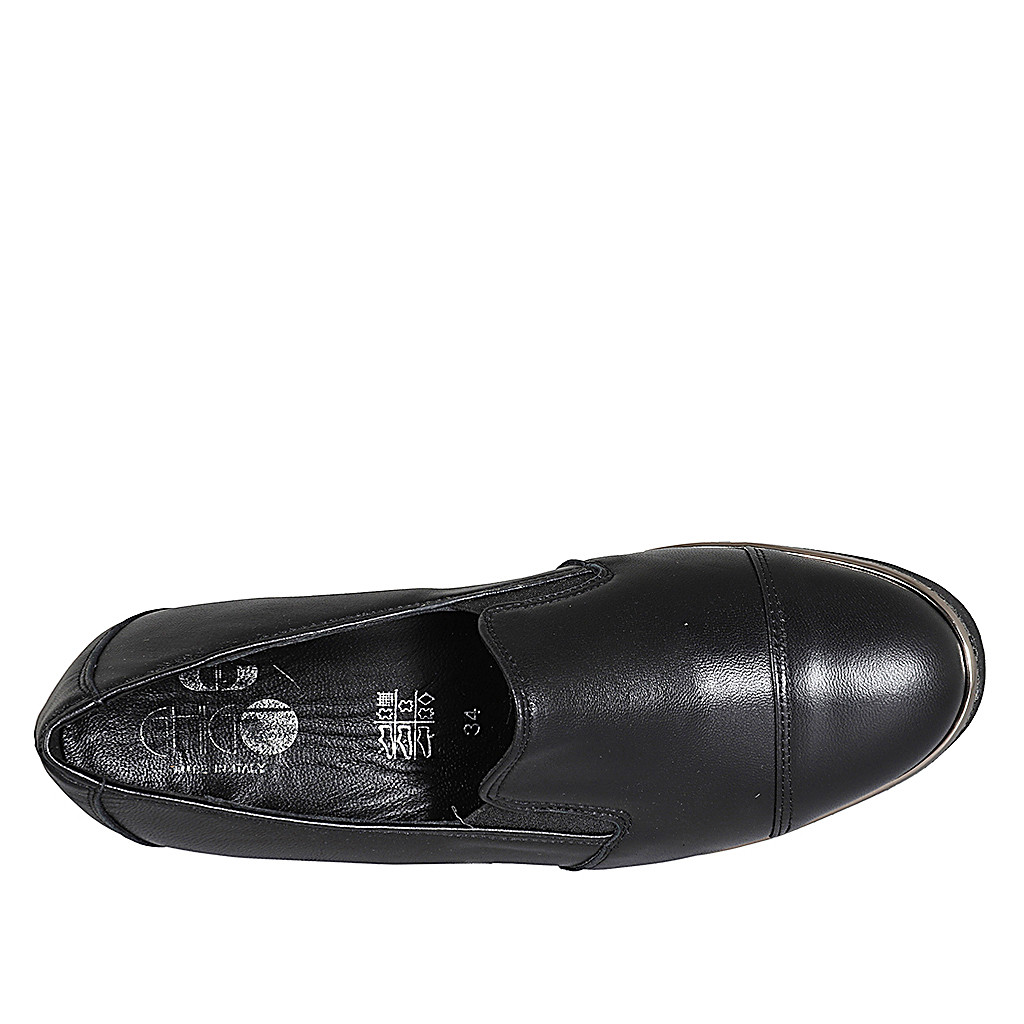 Woman's mocassin with elastic bands, captoe and removable insole in black leather wedge heel 4