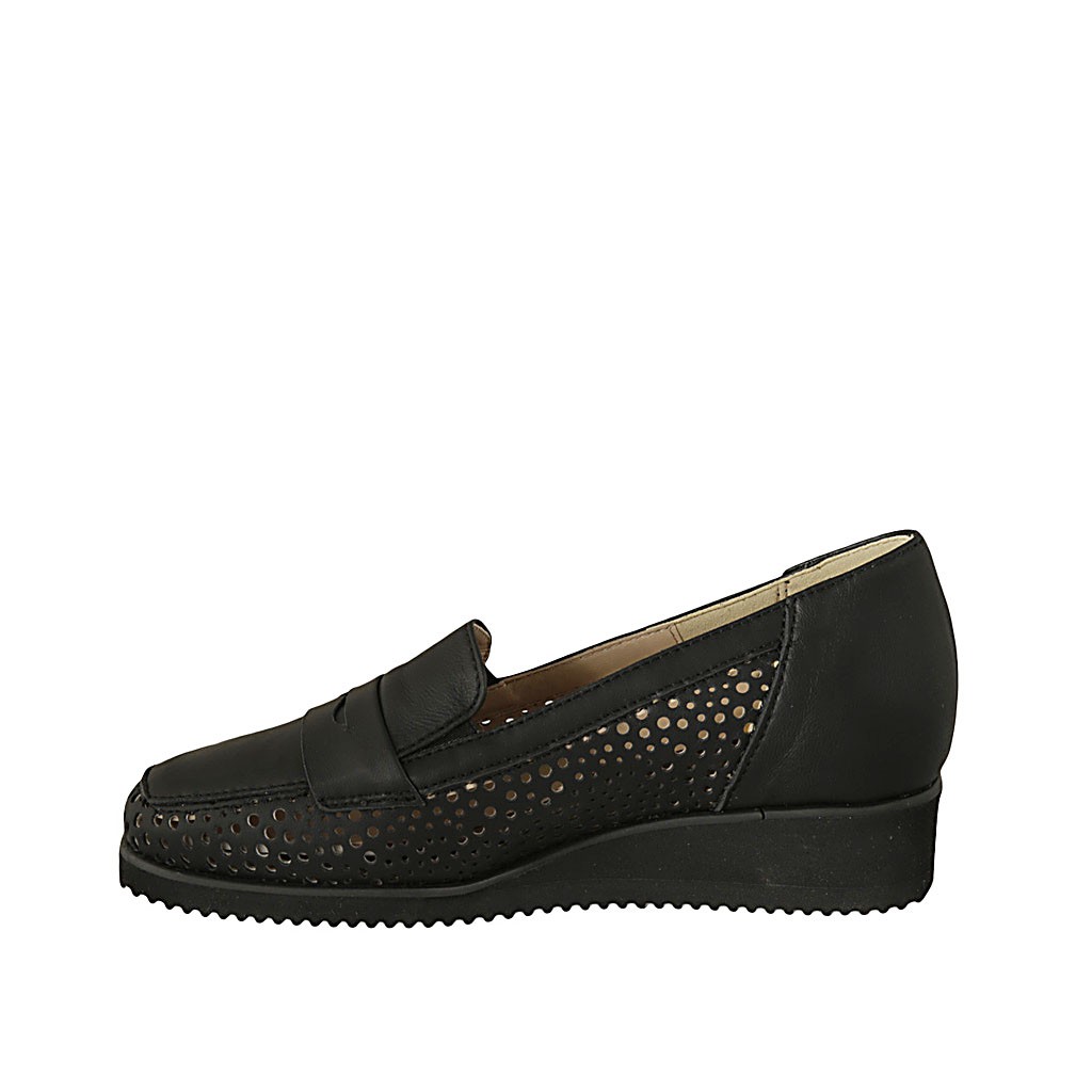 Woman's loafer with removable insole in black pierced leather wedge heel 3
