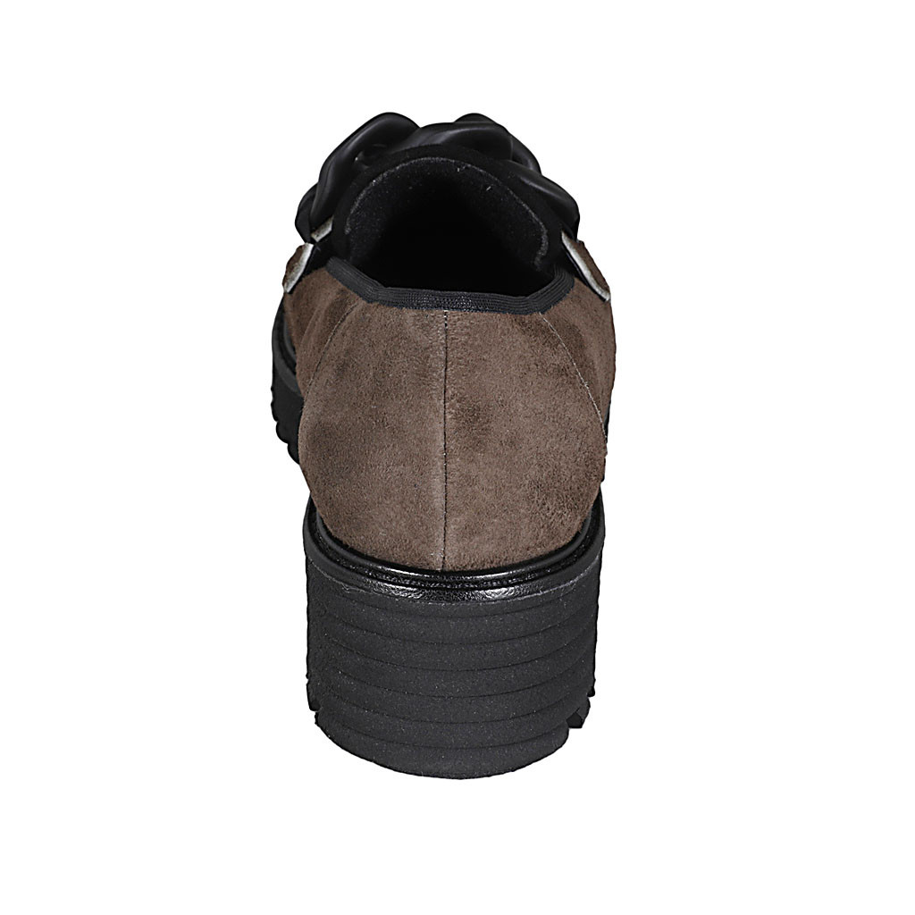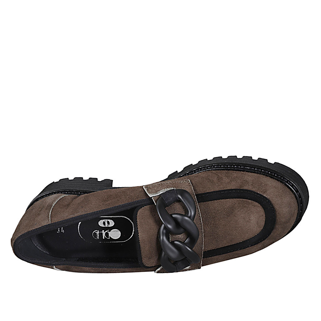 Woman's mocassin with chain in brown and black suede heel 4
