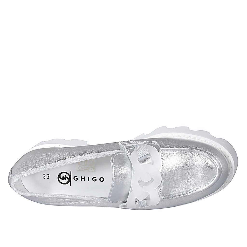 Woman's mocassin with translucent chain in silver laminated leather heel 4