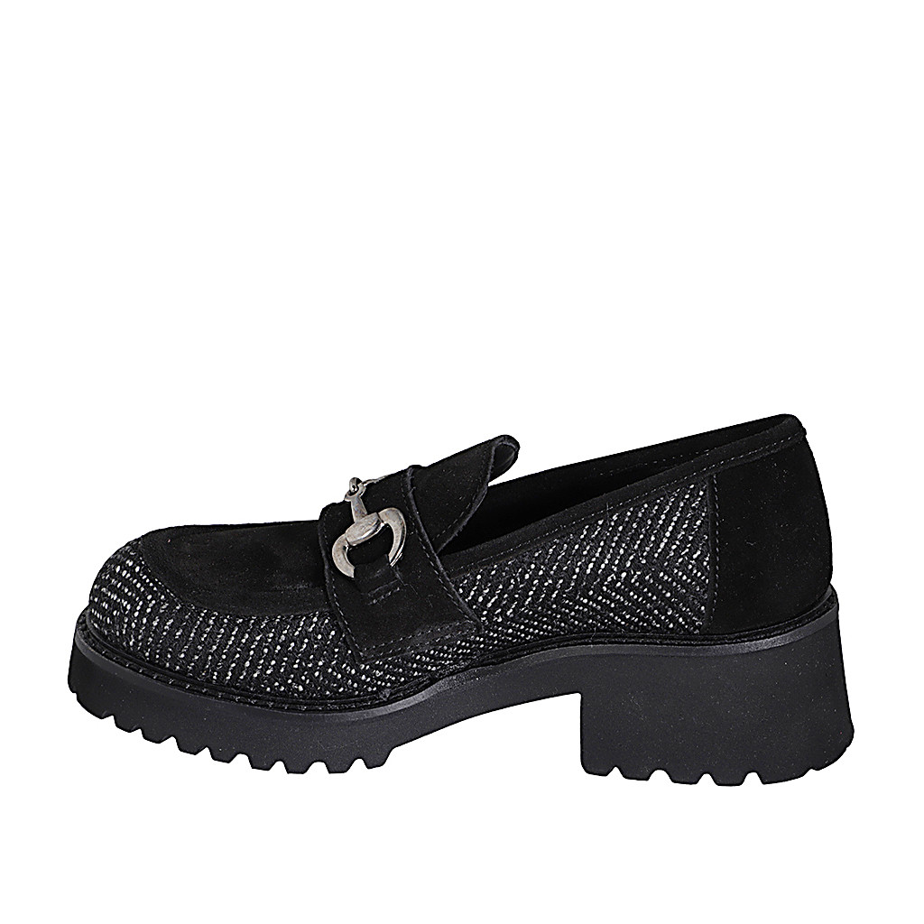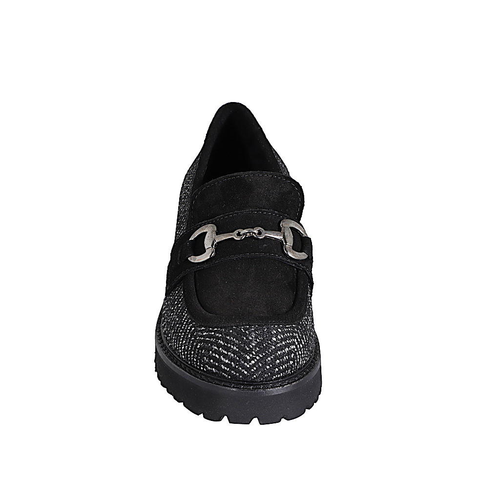 Woman's loafer shoes with metallic accessory in black suede and herringbone fabric heel 5