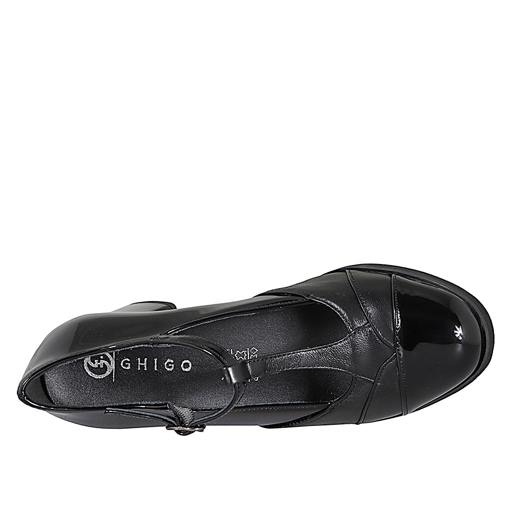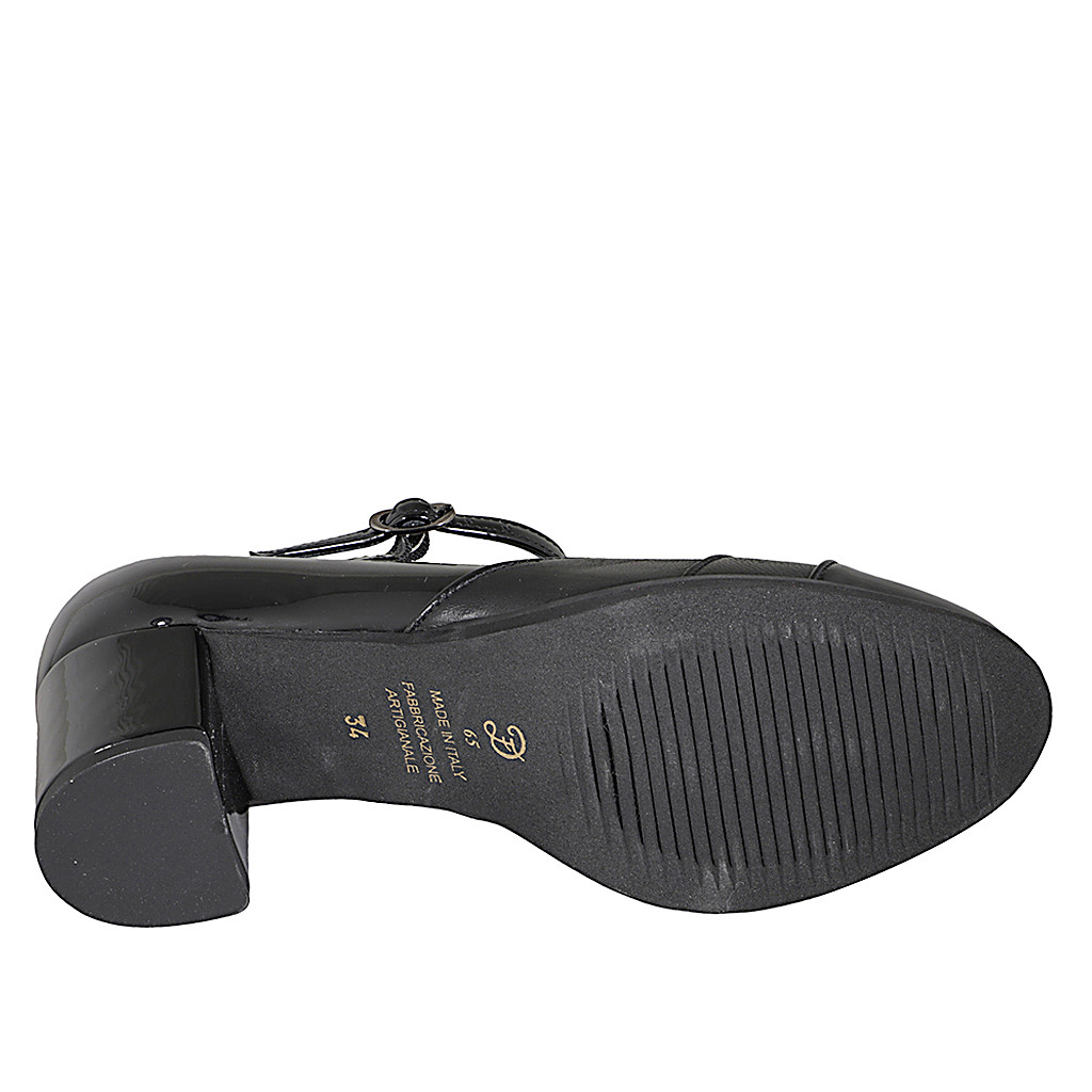 Woman's pump with removable insole and T-strap in black patent leather and leather heel 5