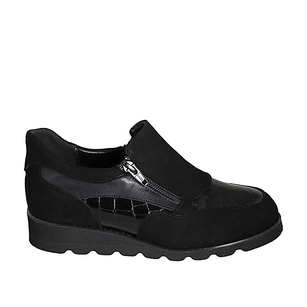 Woman's sneaker with zippers and removable insole in black suede and printed patent leather wedge heel 3