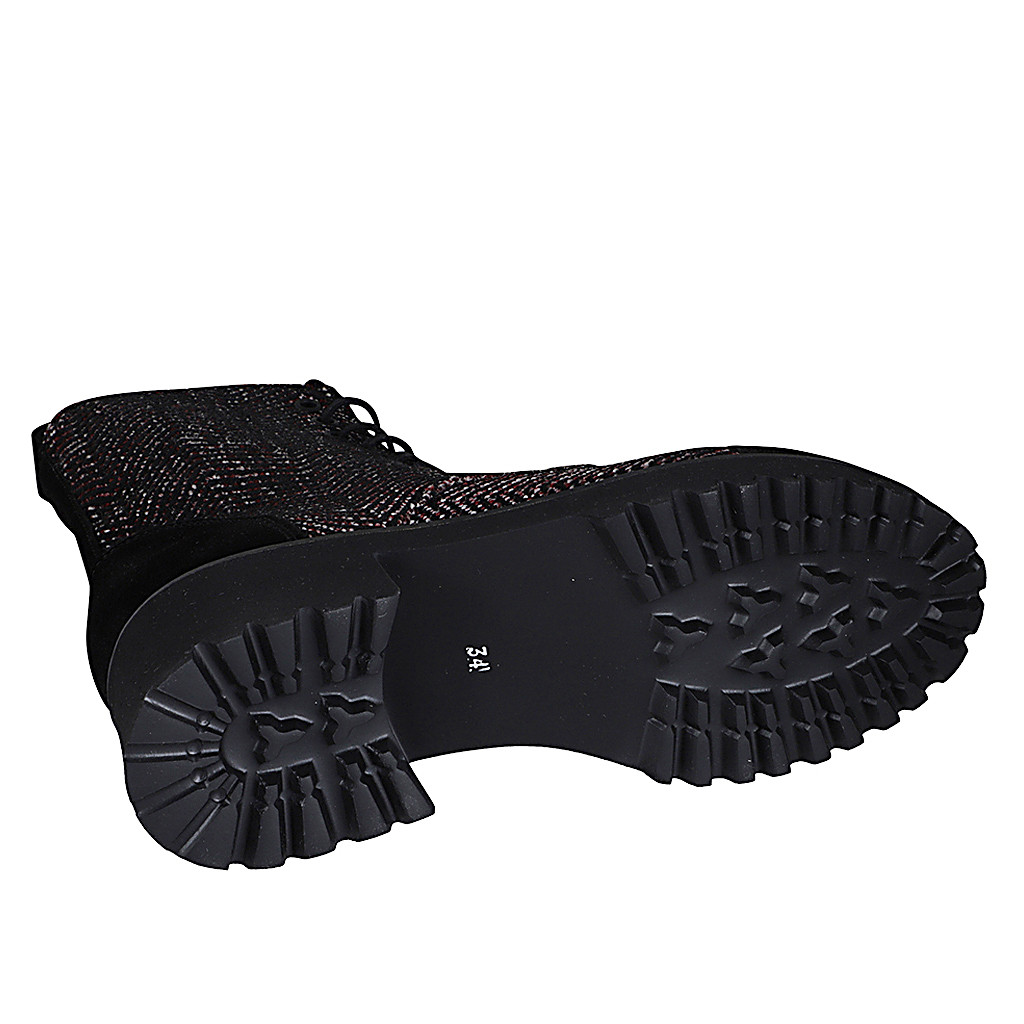 Lace-up women's ankle boot with black suede toe cap and black, white and maroon fabric heel 5