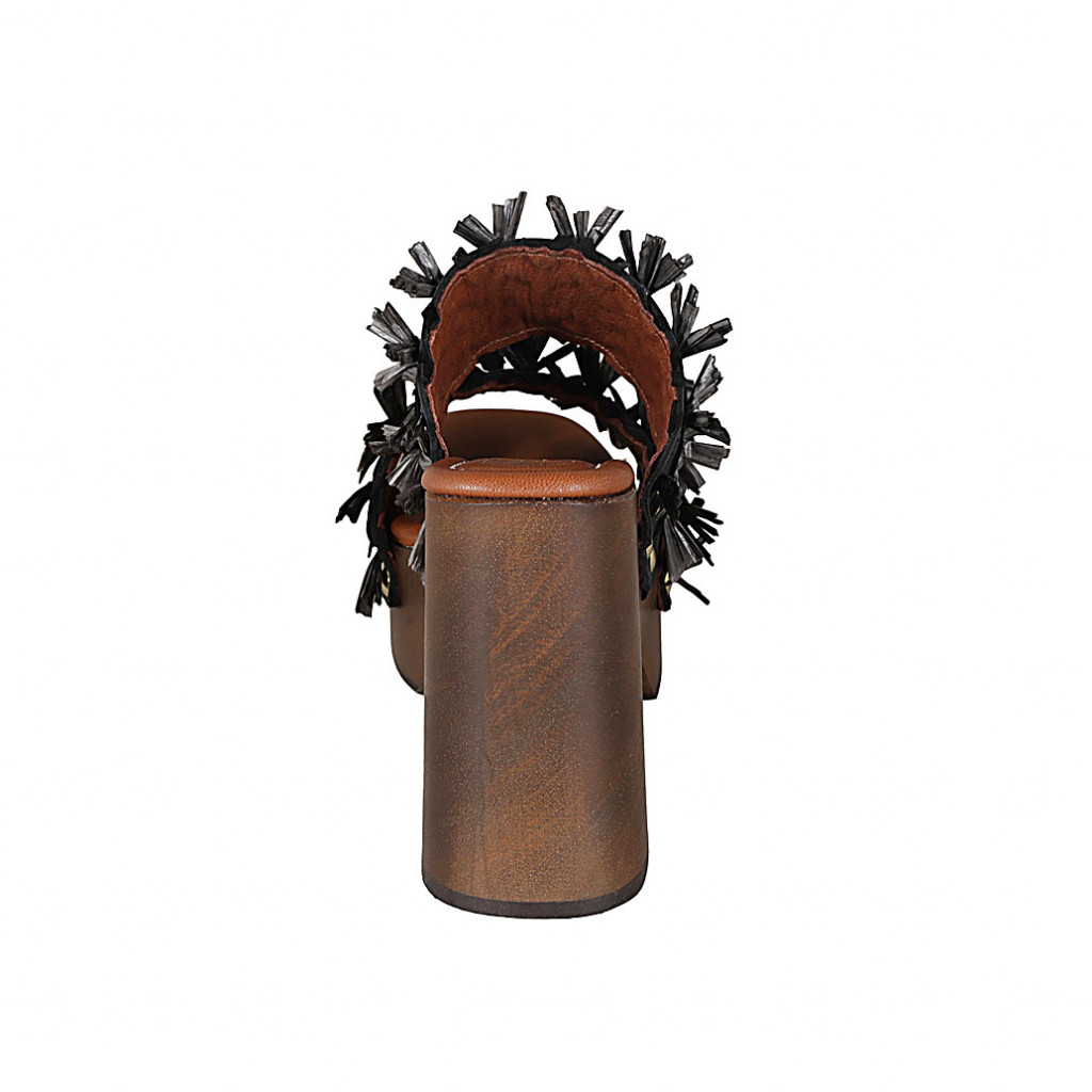 Woman's mule with platform, fringes and studs in black leather, suede and grey raffia heel 12