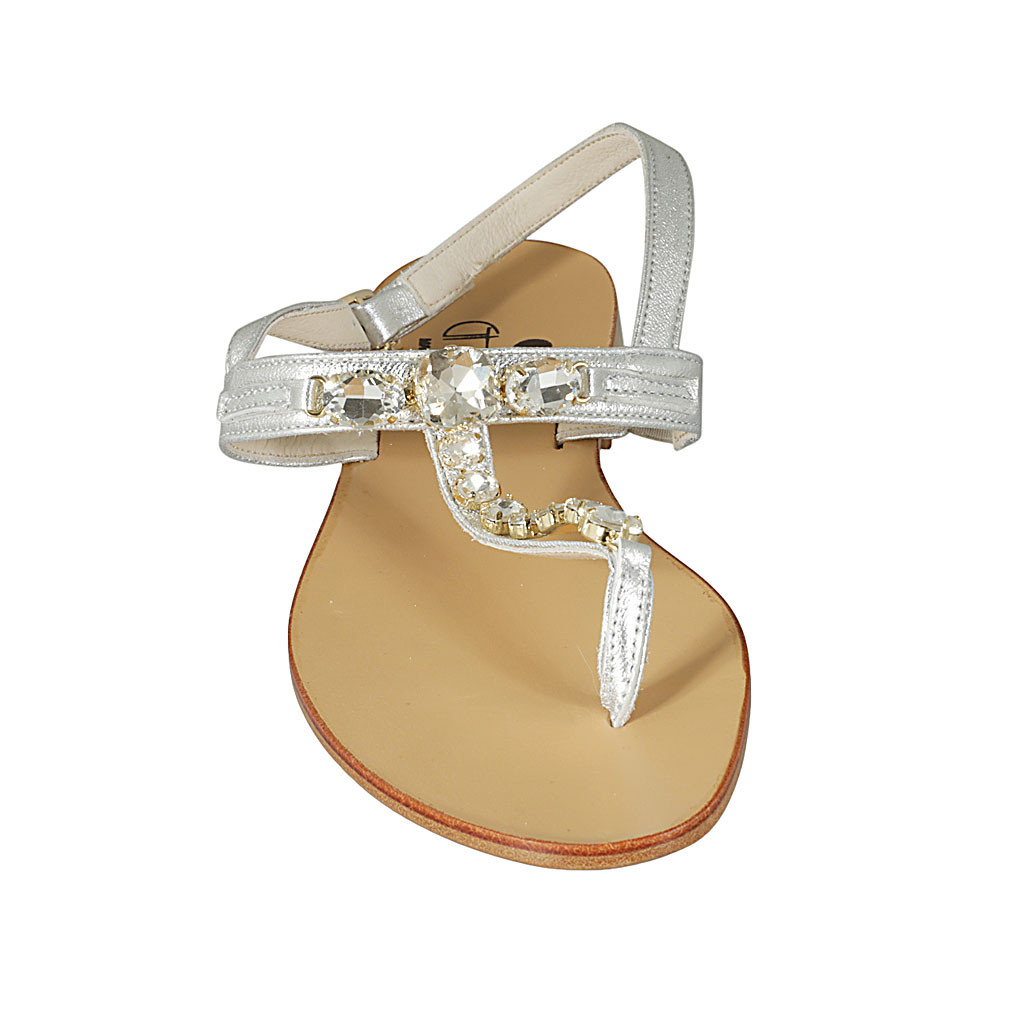 Woman's thong sandal in silver laminated leather with rhinestones heel 2