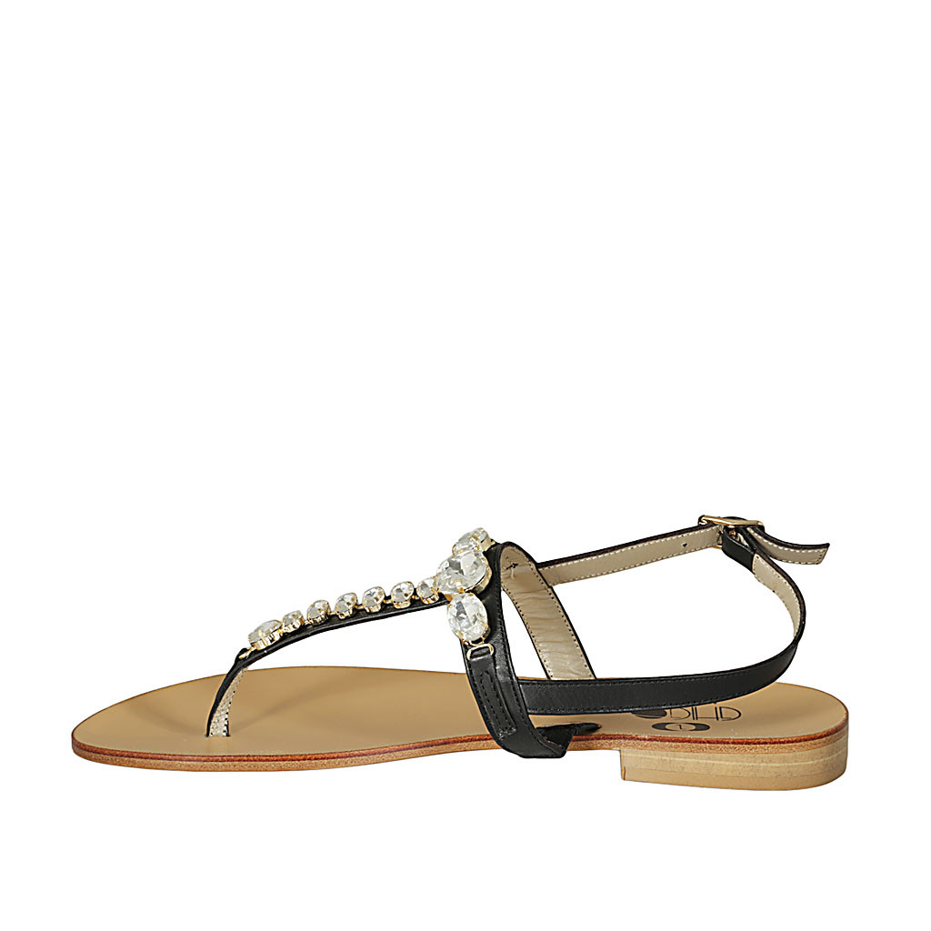 Woman's thong sandal in black leather with rhinestones heel 2