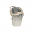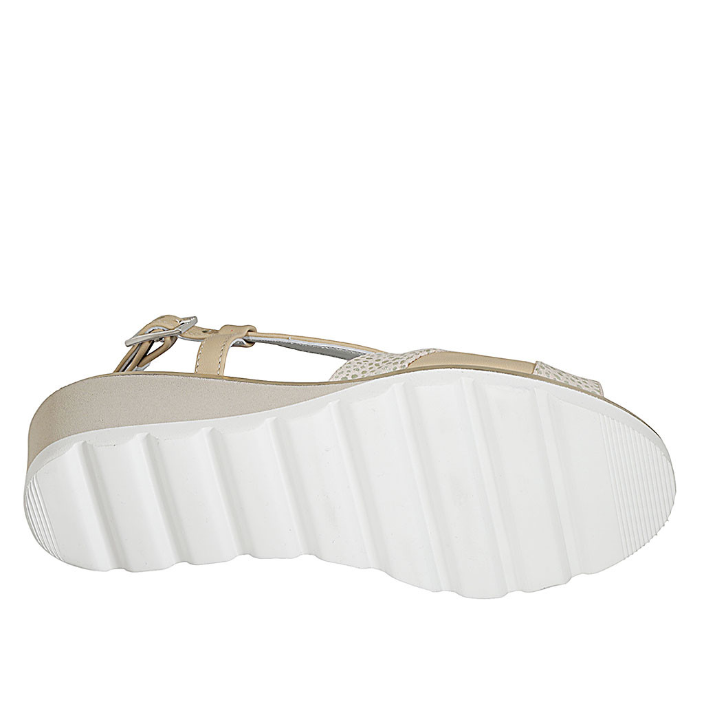 Woman's sandal in beige leather and platinum printed suede with elastic band and wedge heel 5