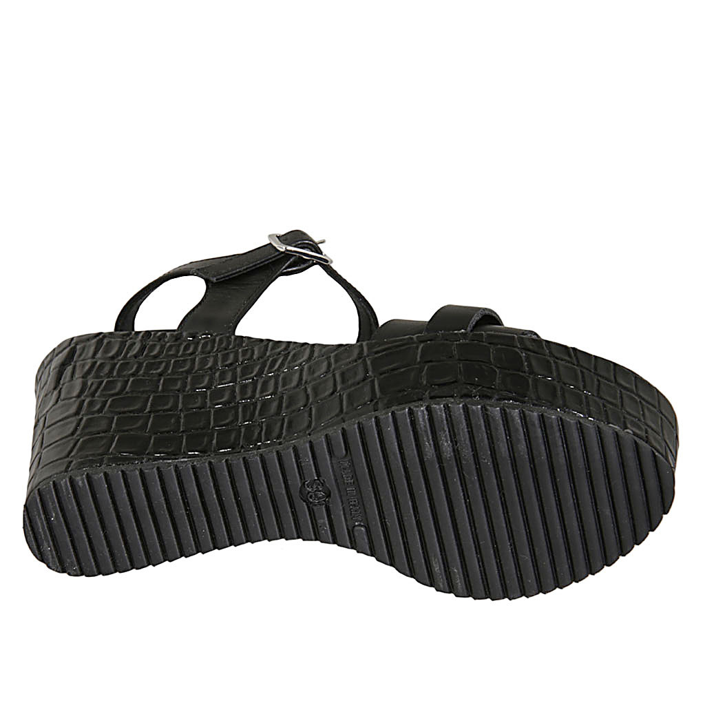 Woman's strap sandal in black leather with platform and printed wedge heel 9