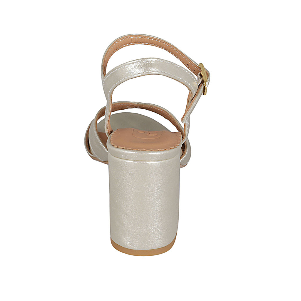 Woman's sandal in platinum laminated leather with strap heel 7