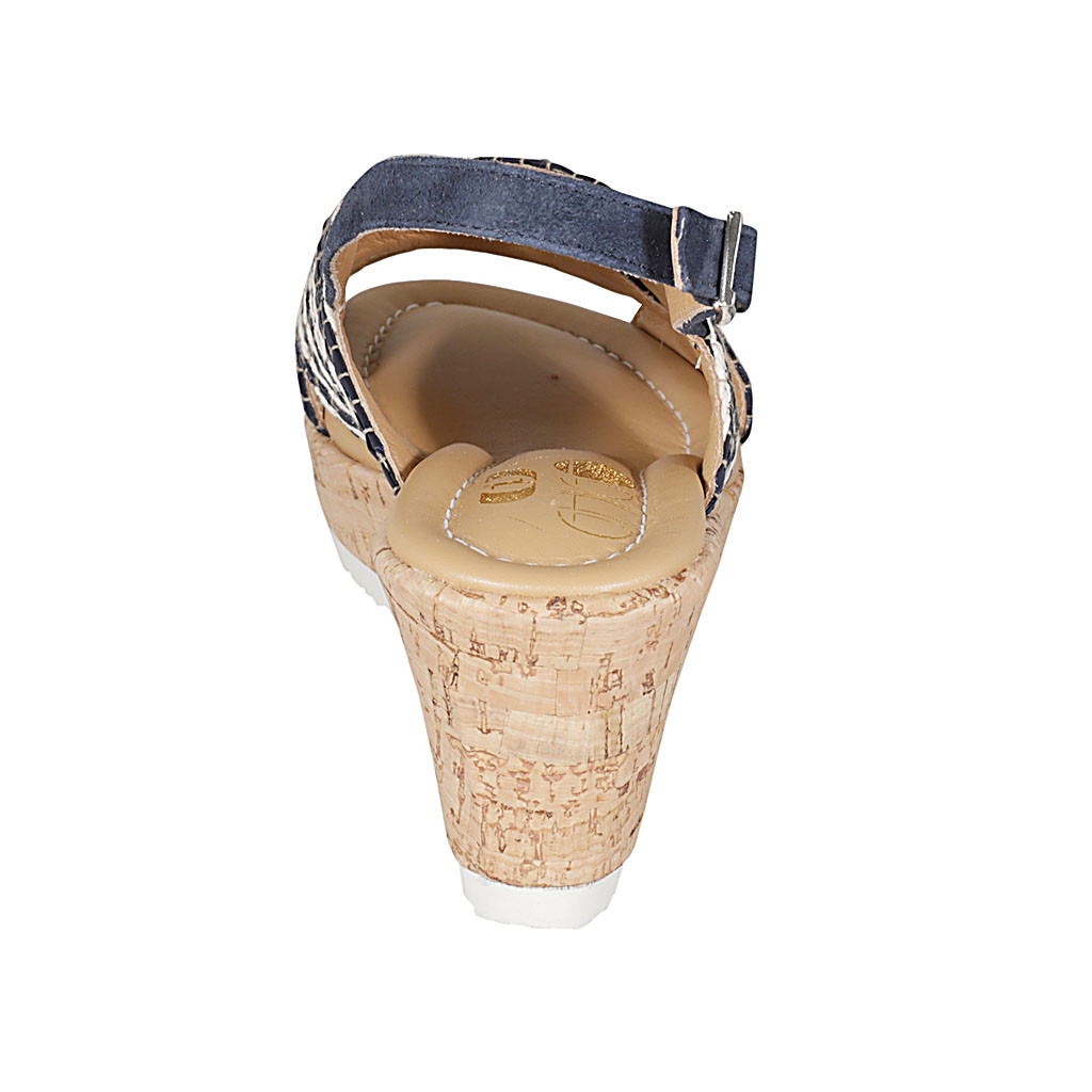 Woman's sandal in multicolored raffia and blue suede with platform and wedge heel 7