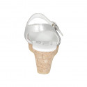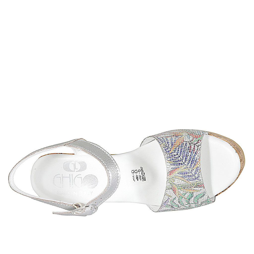 Woman's strap sandal with platform in white laminated leather and multicolored printed wedge heel 12