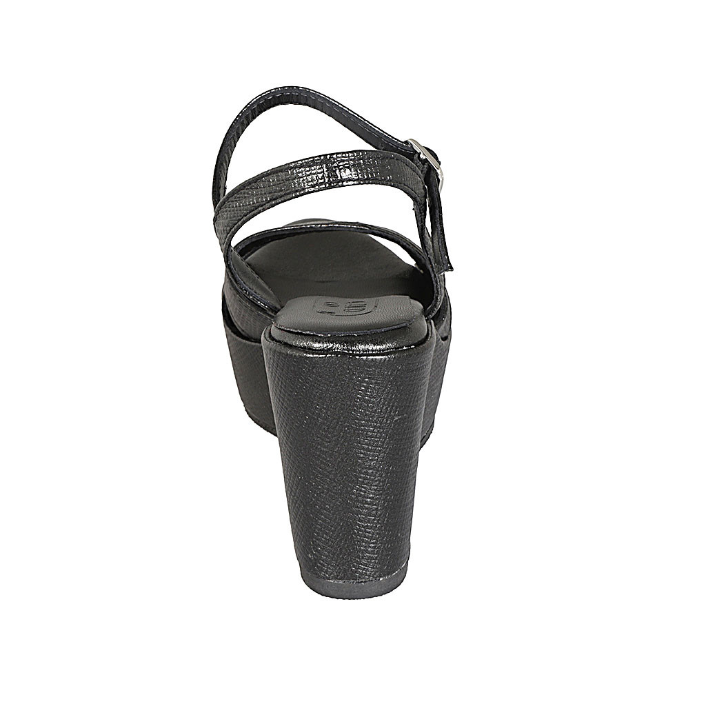 Woman's strap sandal in black printed leather with platform and wedge heel 9
