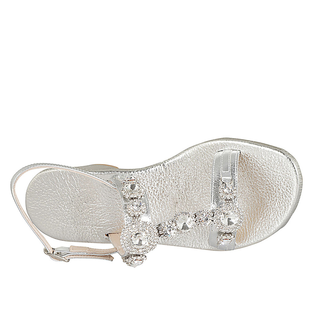 Woman's sandal with crystal flower-shaped rhinestones in laminated silver leather heel 6