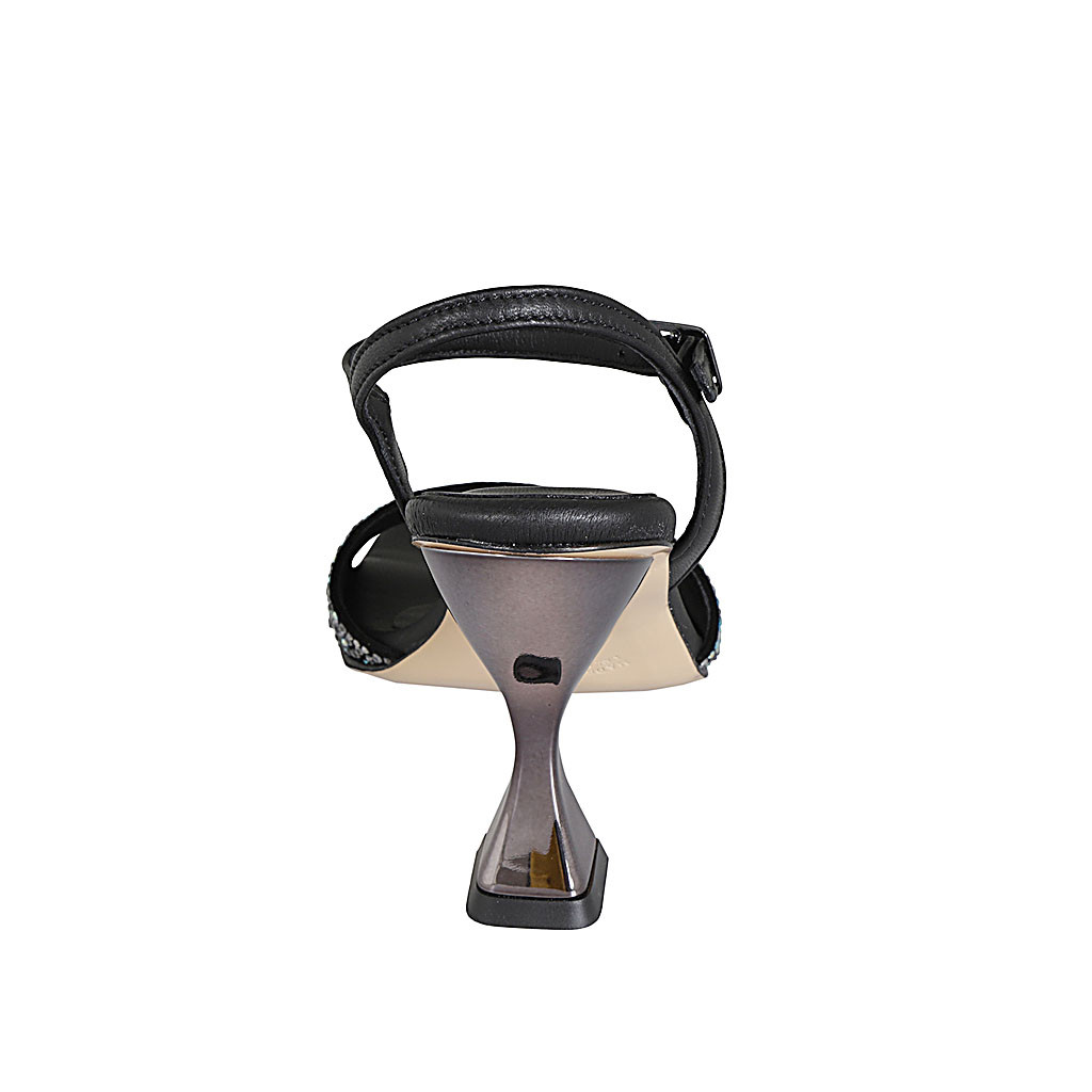 Woman's strap sandal with multicolored crystal rhinestones in black leather heel 10