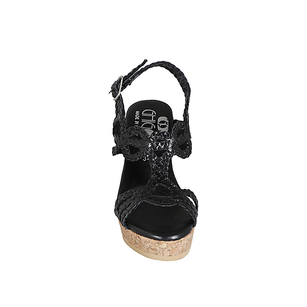 Woman's sandal in black braided leather with platform and wedge heel 9