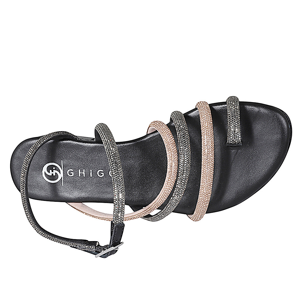 Woman's thong sandal in black leather with silver and copper rhinestones and strap heel 2