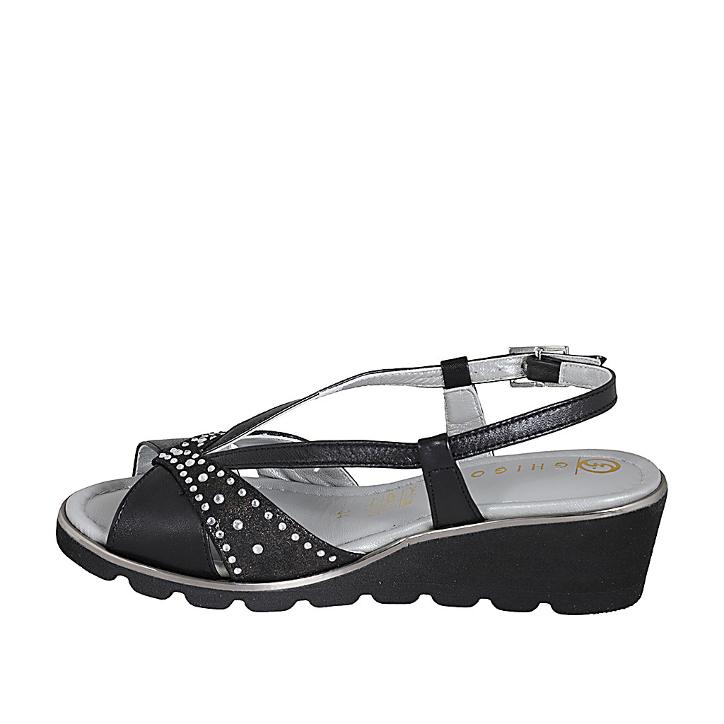 Woman's sandal in black leather and laminated printed suede with rhinestones and wedge heel 4