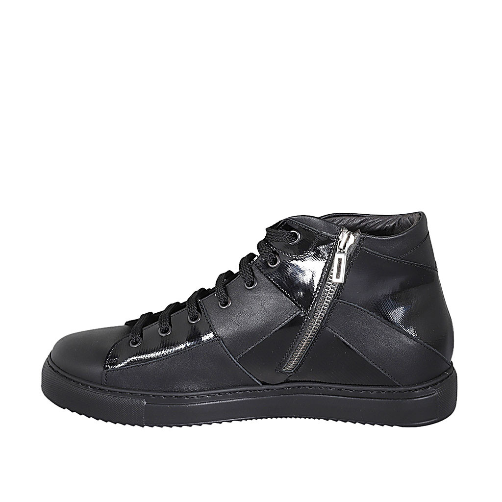 Woman's laced shoe with zipper in black leather and patent leather wedge heel 3